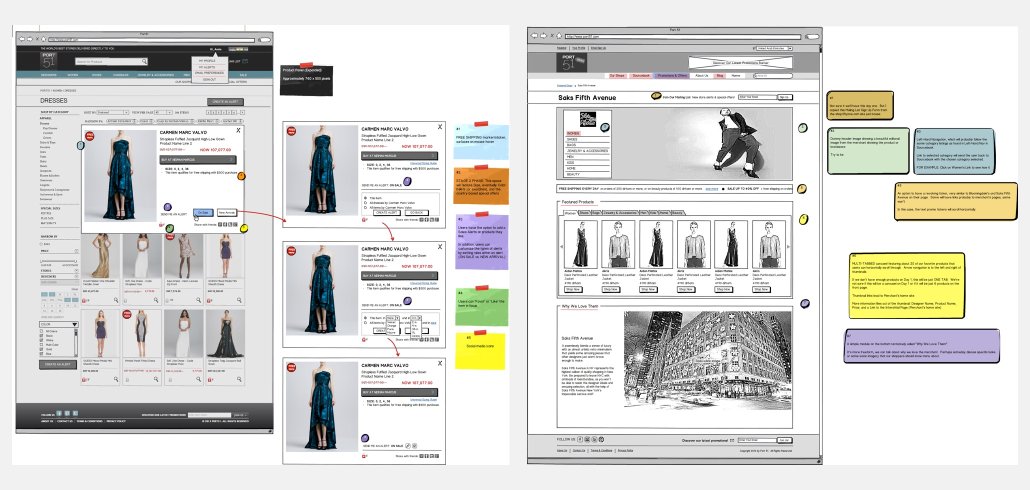 Sample annotated wireframes of Port51’s product listings page and merchant storefronts.