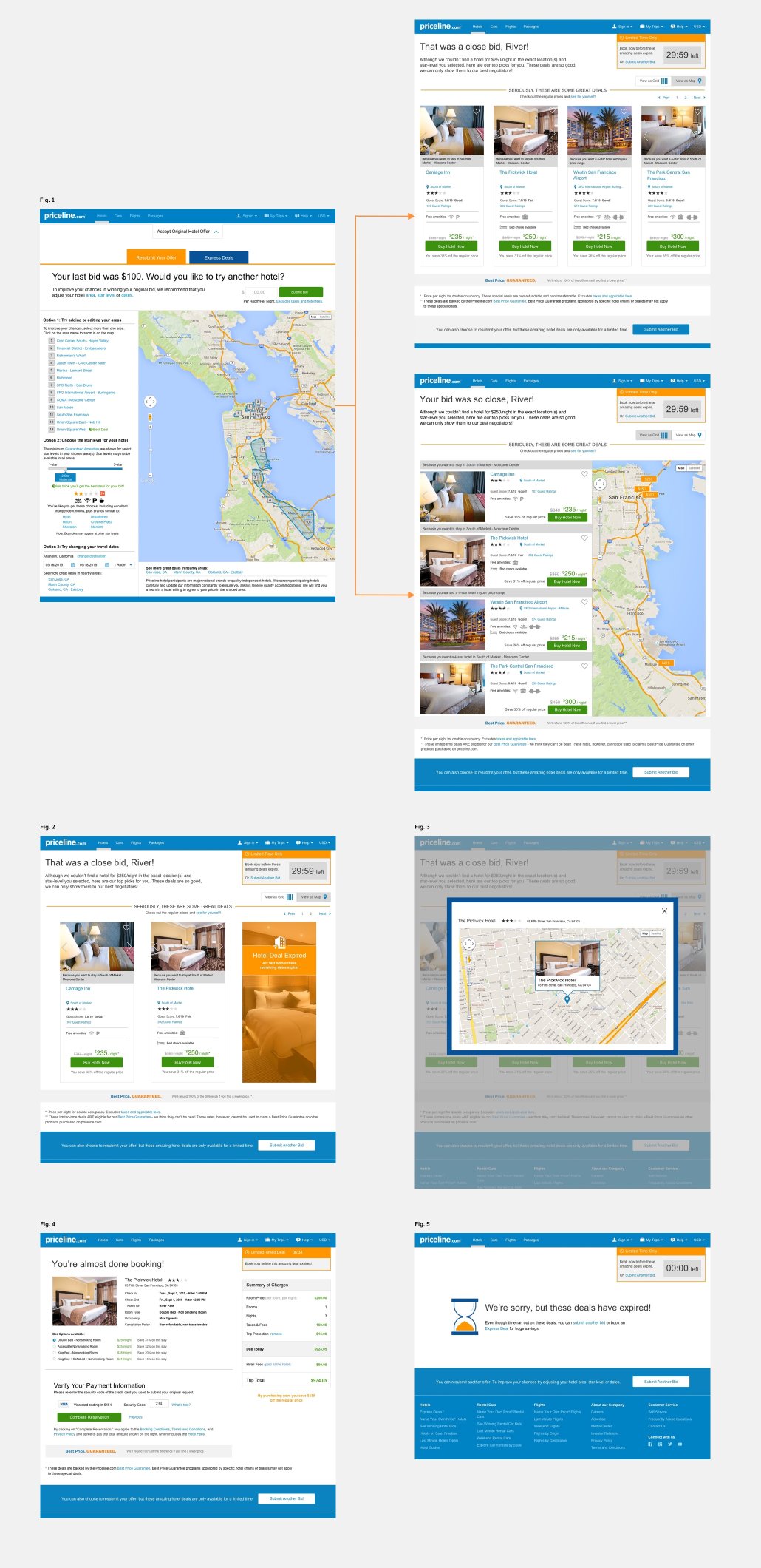 Deal Reveals final UI design. Fig. 1 - NYOP bid page with the UI redesigned from legacy web standards, user lands on a deal reveal page with toggle view options; Fig 2 - Example with fewer revealed hotels; Fig. 3 - Map overlay for revealed hotel; Fig. 4 - Contract/Checkout reservation page; Fig. 5 - Scenario if time runs out.